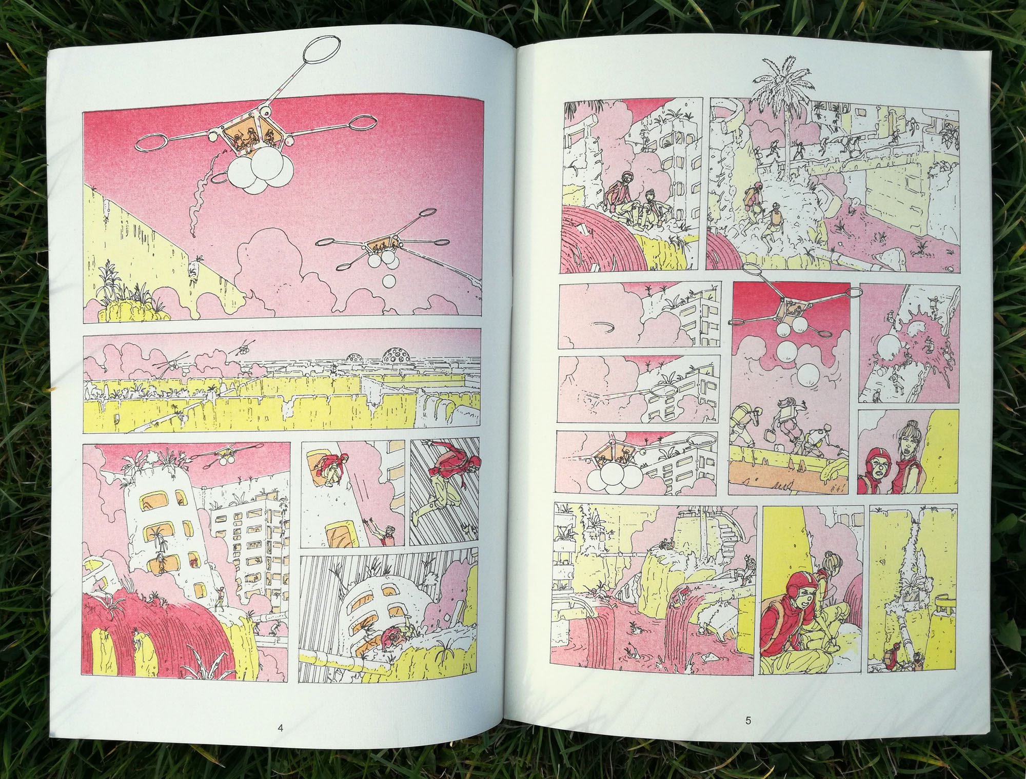 The book itself is 13 pages, and it’s a fragile comic. Propagation and Seed Dispersal of Human/Plant Hybrids on 625B is printed in red and yellow, using a risograph with thin, delicate paper. I appreciate Lando’s strong sense of composition and thin line. The pages in all of Lando’s work are constructed just so, but there’s this tendency to break out of panel enclosures to make scenes feel more alive. You can see it in the images sampled, where a part of a drone sticks out of its enclosing panel, suggesting a descending movement. You can almost hear the copter blades whine.